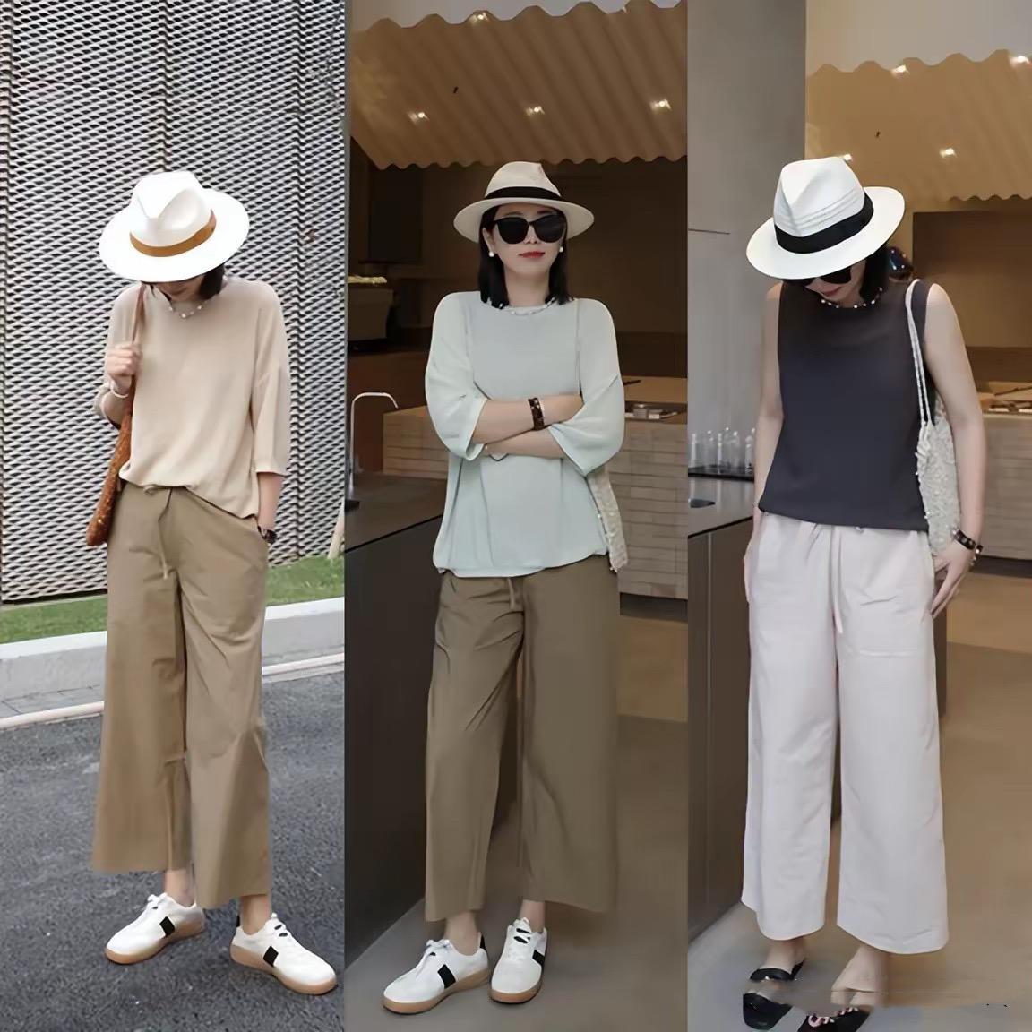 如果你的個子不夠高、或者身材不夠勻稱,都可以嘗試選擇這種寬鬆的闊腿褲,幾分闊腿褲露出腳踝的線條,視覺上還更輕盈了些。