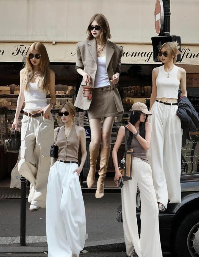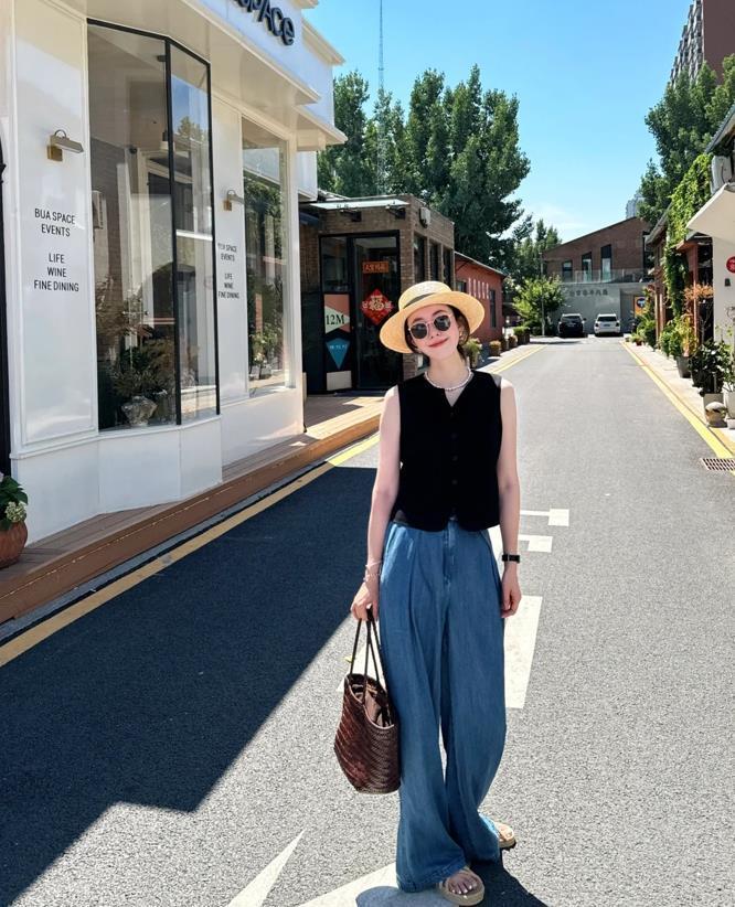 鬆弛感的夏天,纔是最合適的吧,黑色馬甲+牛仔藍闊腿褲,這樣的搭配纔是鬆弛感穿搭的天花板吧。而且配色上也十分經典耐看,遮肉顯瘦效果真的一級棒的。