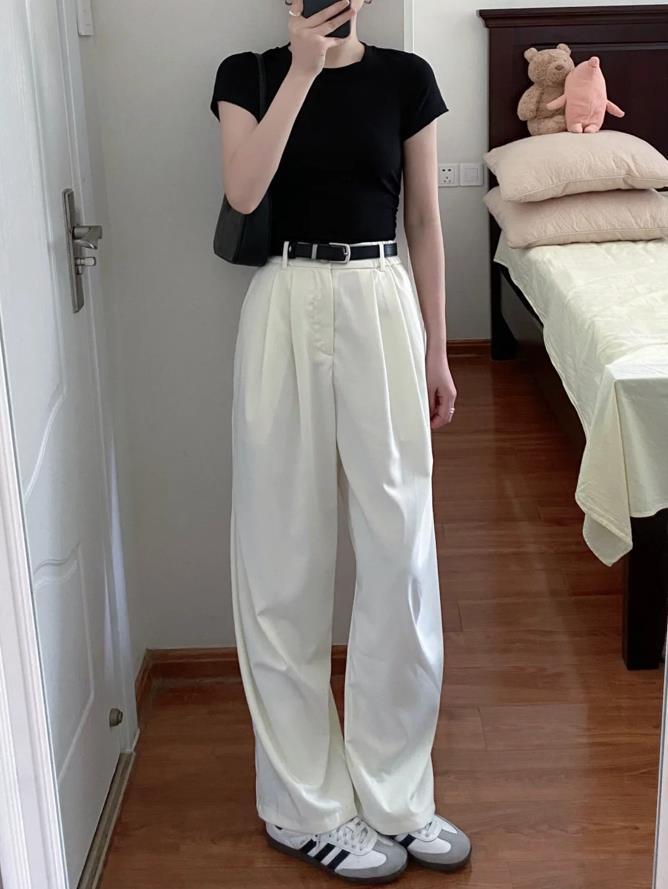 黑白配的搭配,真的太時髦和高級了,怎麼看都不覺得出錯,當你不知道選擇什麼顏色來配時,首先黑色+白色就是最不錯的選擇。黑色正肩短袖+白色休閒西裝褲,腳下踩着一雙德訓鞋,舒適極了。