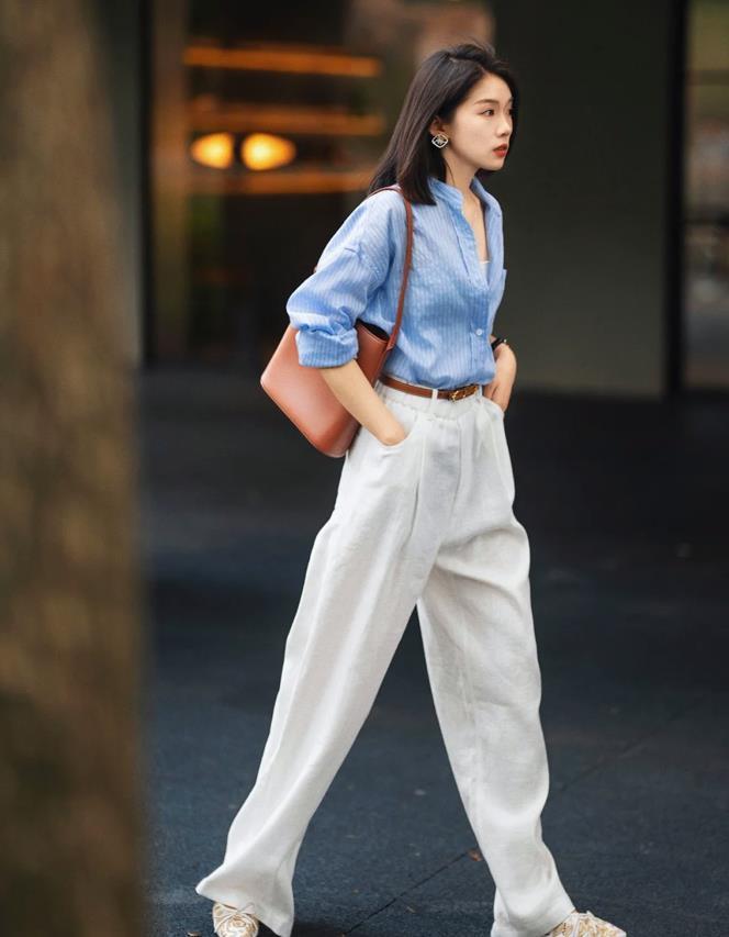 夏天真的是離不開亞麻穿搭啊,因爲這種面料透氣性很強,也能讓你穿得舒適自在,淺藍色襯衫+白色亞麻闊腿褲,雖然是白色,可穿起來卻完全不會給人顯胖的效果,反而是很舒適和鬆弛。