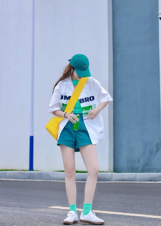 雪碧配色看起來也太夏天了,夏天就應該這樣穿,太清爽和吸睛了,寬鬆的白色襯衫和綠色短褲相配,這樣的配色很難不讓人喜歡。腳上的綠色襪子和褲子以及上衣都進行了呼應,增加了整個造型的配色協調性。