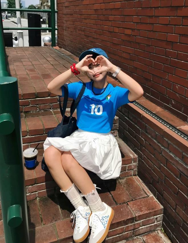 復古運動風的穿搭,看起來也非常不錯呢,夏天就是應該入手一抹藍色,利落的短款T恤,搭配白色花苞半身短裙,腳下踩着一雙德訓鞋,一整個青春活力俏皮範,滿滿的少女風有沒有?