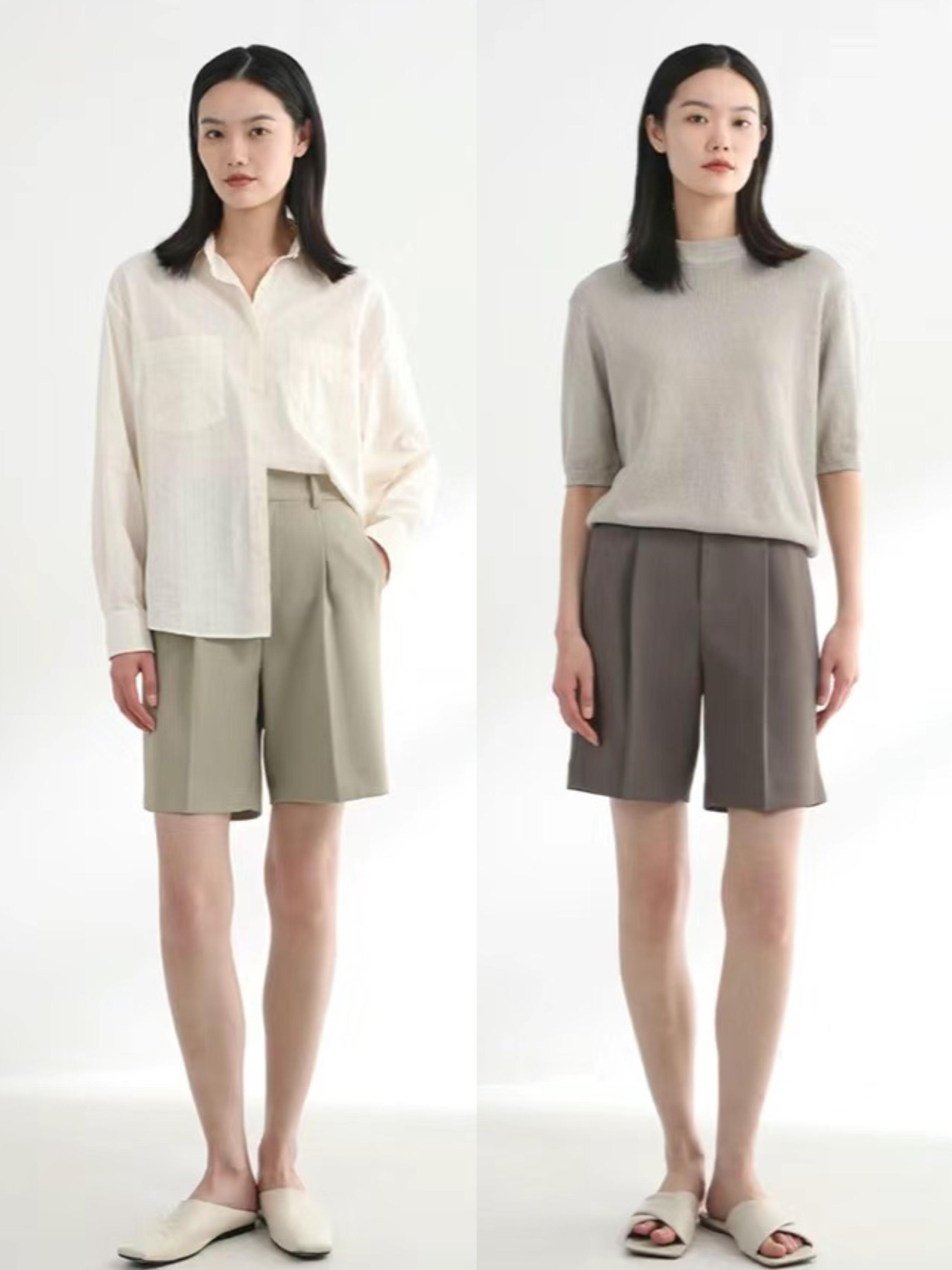 奶奶短褲,通過腰部捏褶+流暢剪裁,形成更大方的線條美。高腰的款式、寬鬆的褲筒,大量感的對比,顯得雙腿更加纖細。