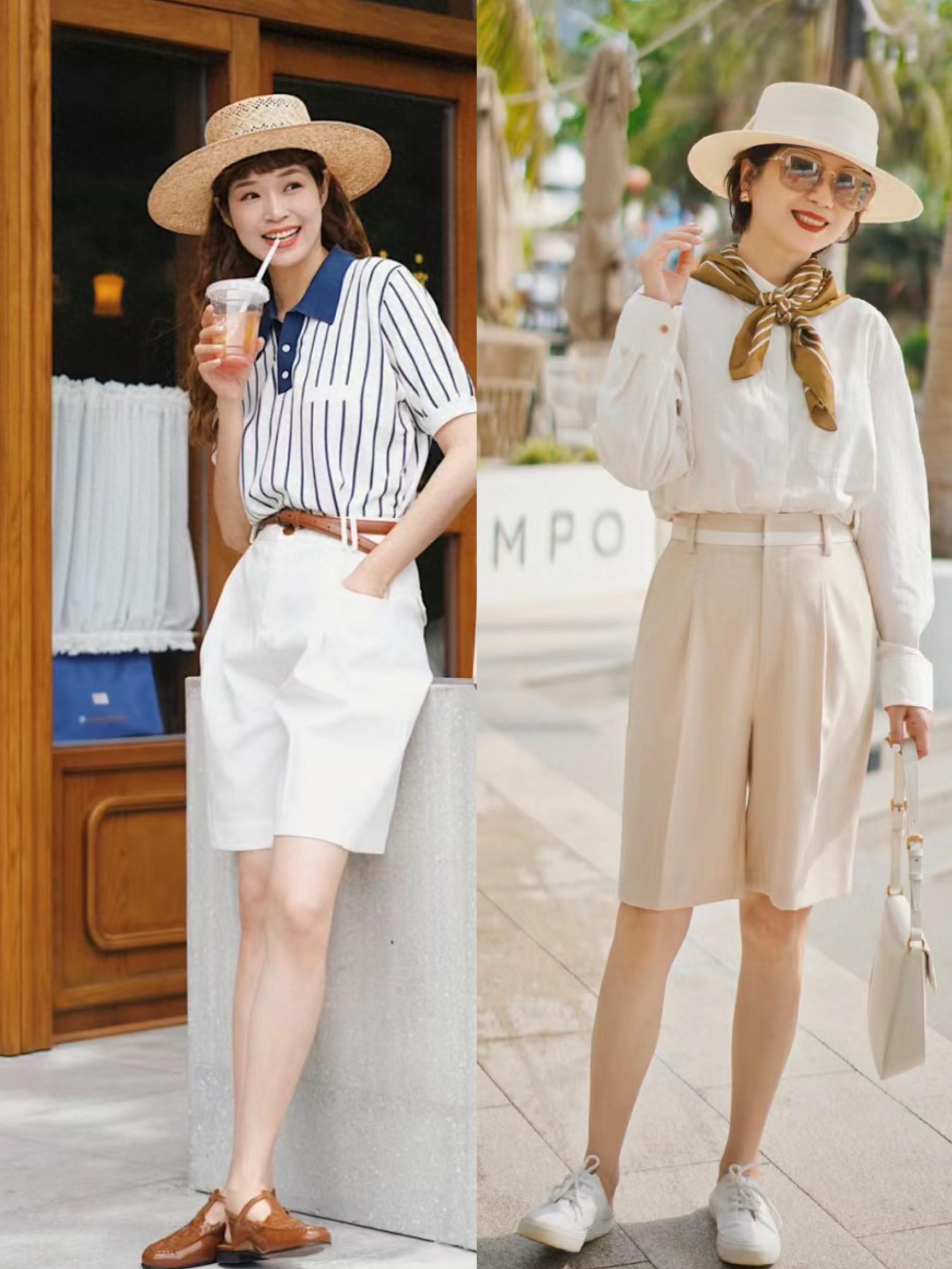 配飾的點綴,可以增強風格屬性。比如白襯衫+百慕大中褲,配絲巾、草編帽就更休閒一些。而百慕大中褲+腰帶、耳釘,則更加精緻考究一些,適合通勤上班。