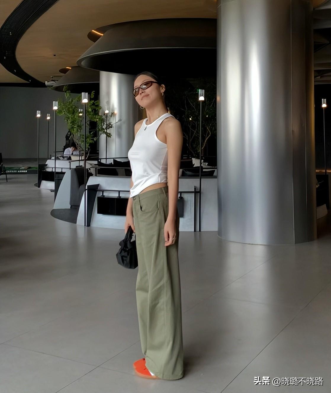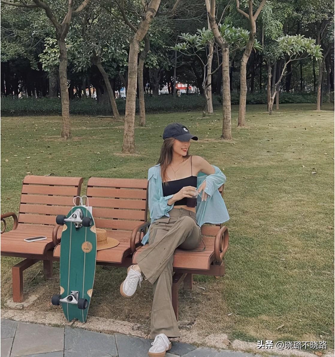 2、美式街頭穿搭模板:露臍上衣+工裝褲