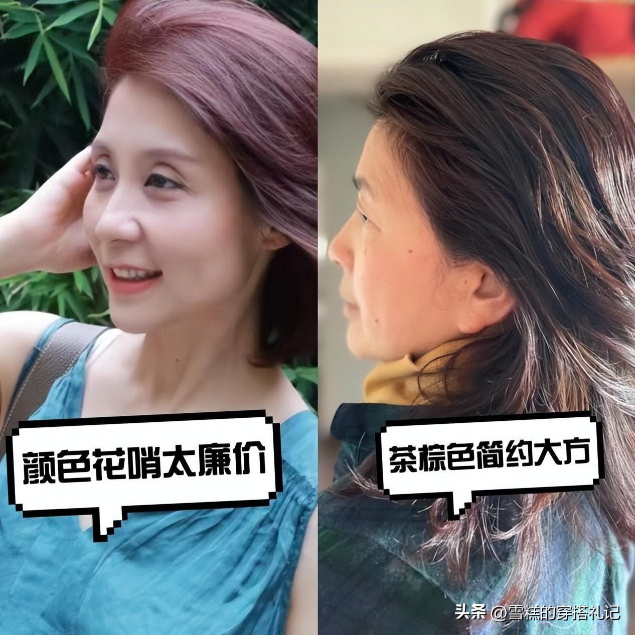 除了整個髮型的選擇之外,髮色挑選也是相當關鍵的。因爲隨着年紀不斷的增加,我們的髮色也發生了很大的變化,沒有了,從前的烏黑髮亮,髮尾處有一些發黃,髮根處有一些泛白,不均勻的髮色看起來格外的老氣,大家可以嘗試燙成黑茶色或者茶棕色系列,自然又洋氣。