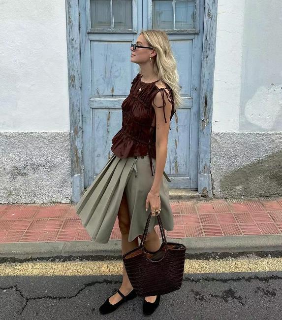 在夏天,半身裙的款式實在是太多了,穿膩了基礎款的話,不妨給自己入手一條設計個性的款,百褶的款式,細節感還是挺強的。上衣選了一件小吊帶,透着清涼又不失小性感。腳下的鞋子是一雙黑色瑪麗珍單鞋,可太舒適溫柔了。
