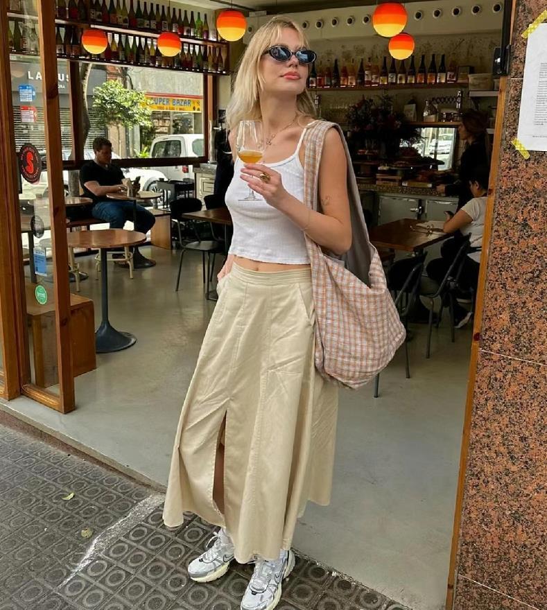 背心和半裙的搭配,也是非常適合夏天的,上下同色系的組合,簡直不要太省心了,短款白背心+白色半身長裙,寬鬆的裙子版型,對身材一點約束感都沒有,很藏肉顯瘦,搭配一雙亮色的運動鞋,不經意就點亮了整個造型。