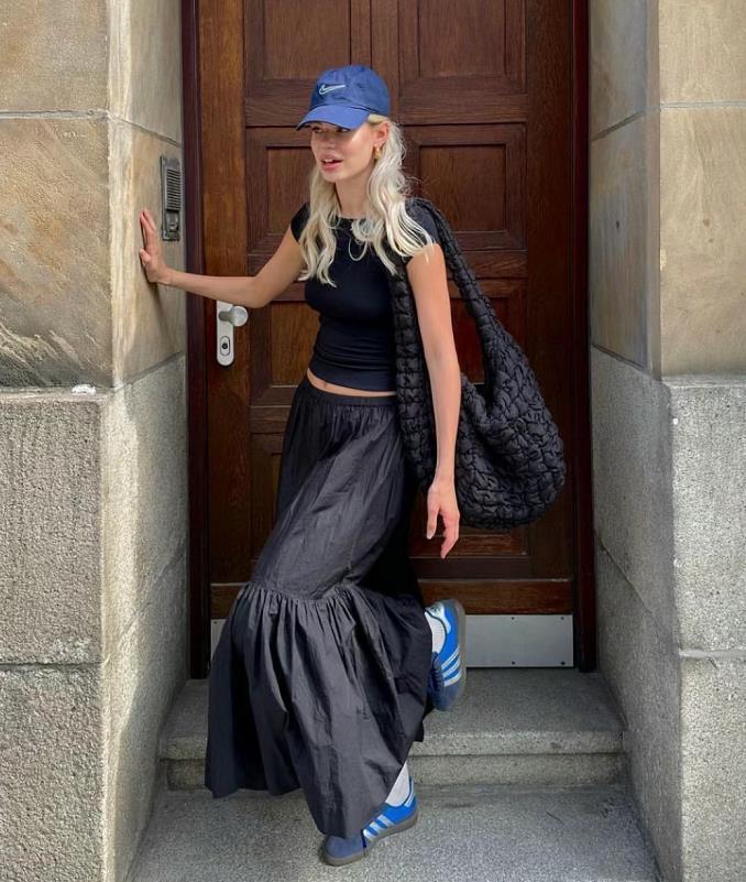 都說在夏天裏穿黑色會很顯沉悶,我看也未必,關鍵還是在於你怎麼去搭配了,黑色修身短款t恤+黑色半身長裙,這種上短下長的組合,對於身材有着極佳的修飾作用,能巧妙拉長腿部線條。鞋子選擇了一雙藍色運動鞋,對整個穿搭都有着提亮的作用。