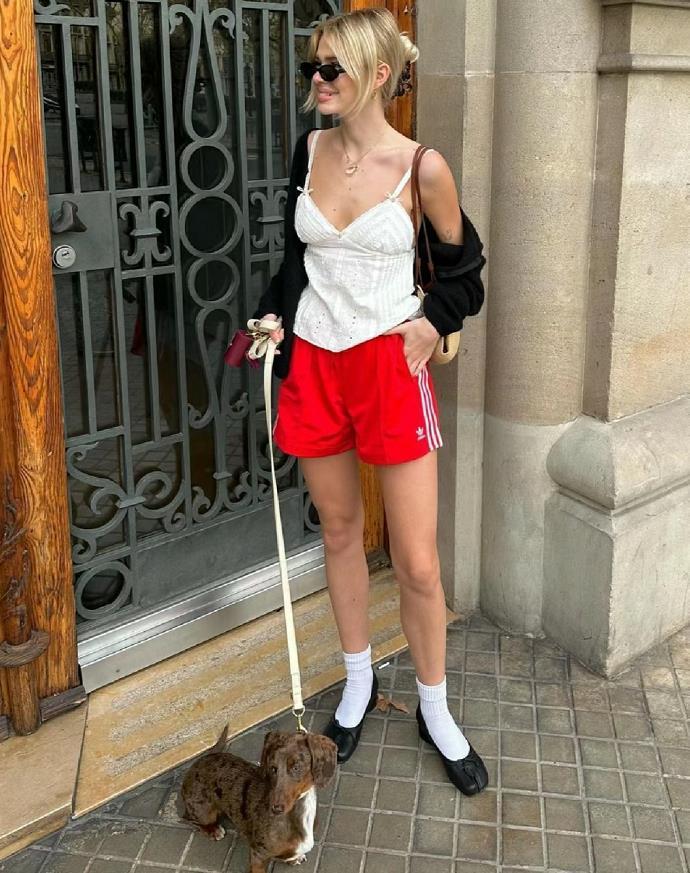 夏天不能穿紅色?當然不!明亮一些的色彩會讓人看起來更吸睛,紅色休閒短褲+白色T恤,很時髦休閒和舒適的一套。腳上還穿着一雙白色的襪子,很好與t恤進行了呼應,這樣的造型看起來就很協調。