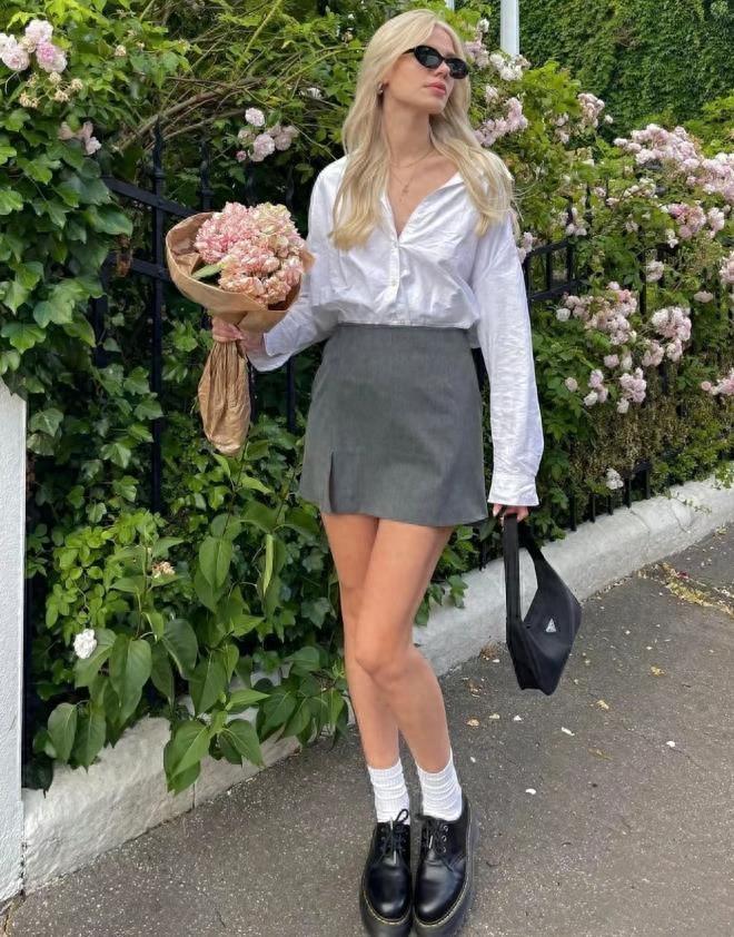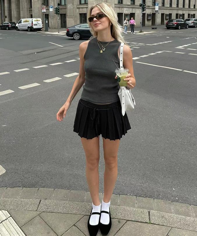 這位博主的穿搭真的很簡單又不失貴氣,明明是非常基礎的單品,可她卻可以穿得那麼時髦,灰色緊身背心+黑色百褶短裙,黑和灰的配色組合,就是有種很高級的既視感。這種上短下短的搭配,小個子女生穿簡直太顯高了。