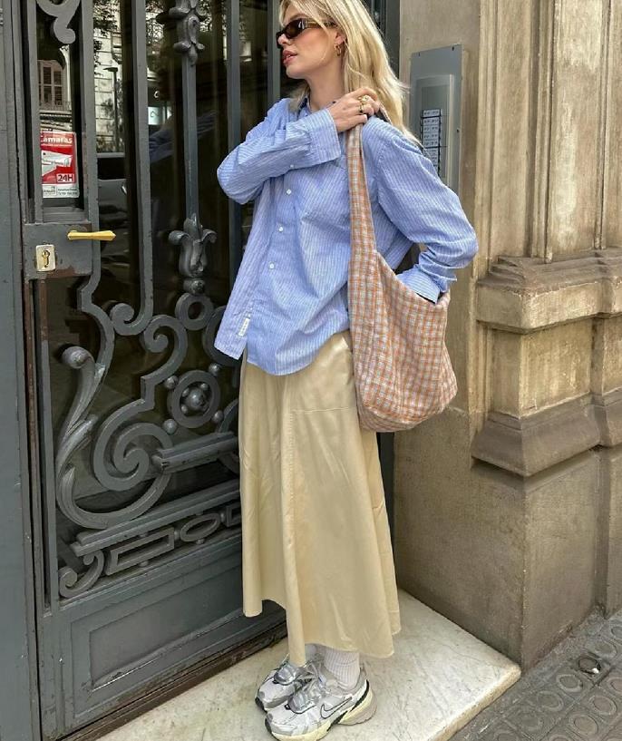 今年夏天,很適合穿襯衫,可以直接選擇單穿,也可以進行下疊穿,藍色的配色,很襯膚色和顯白,寬鬆的版型,也太藏肉顯瘦了。與卡其色半身長裙相配,直筒的裙身版型,也太藏肉了,選擇一雙運動鞋來配,可休閒舒適了。