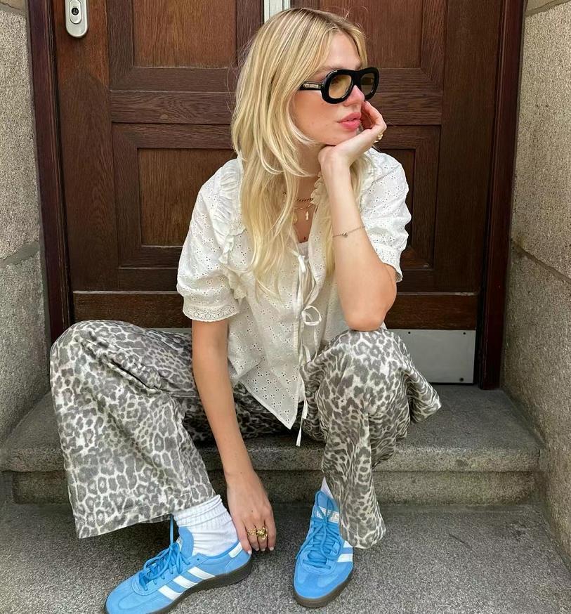 豹紋花色的休閒長褲,一般人可不敢輕易駕馭吧?其實,對於這種款式的褲子,上衣顏色選擇純色即可。不管是襯衫,還是t恤都可以。再搭配上一雙藍色運動鞋,真的太吸睛時髦了。