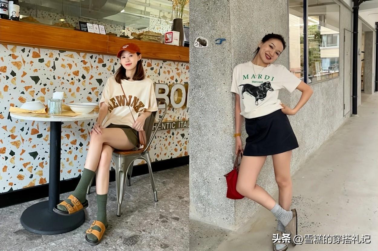 上衣隨便搭配一件T恤,T恤不侷限在純色款式,可以選字母塗鴉款,穿搭個性有街頭感。下半身穿條A字短裙,裙襬寬能和大腿形成落差對比,從而顯得腿瘦,另外裙身是上寬下窄的版型,對胯寬臀肥友好,梨形女人也能放心大膽穿,腳踩勃肯涼鞋配襪子,愜意隨性又瀟灑。