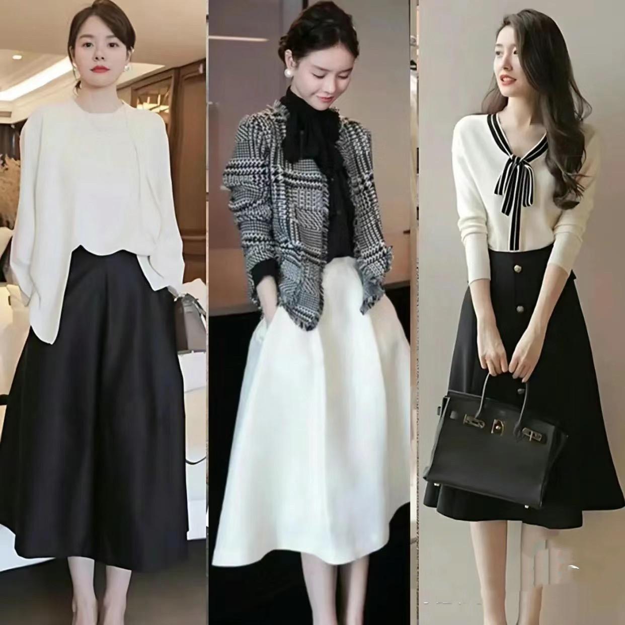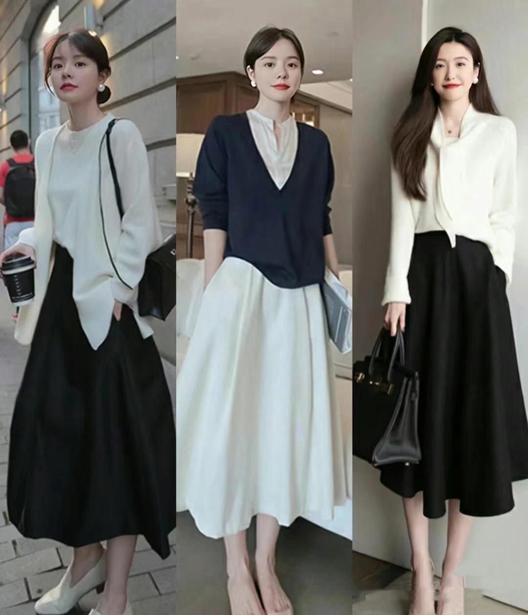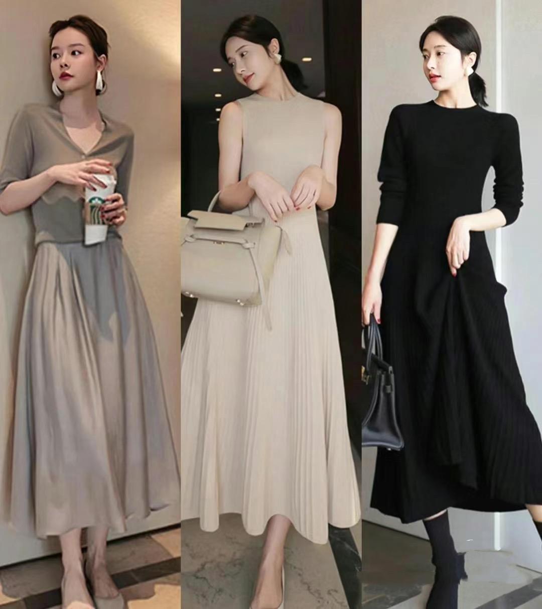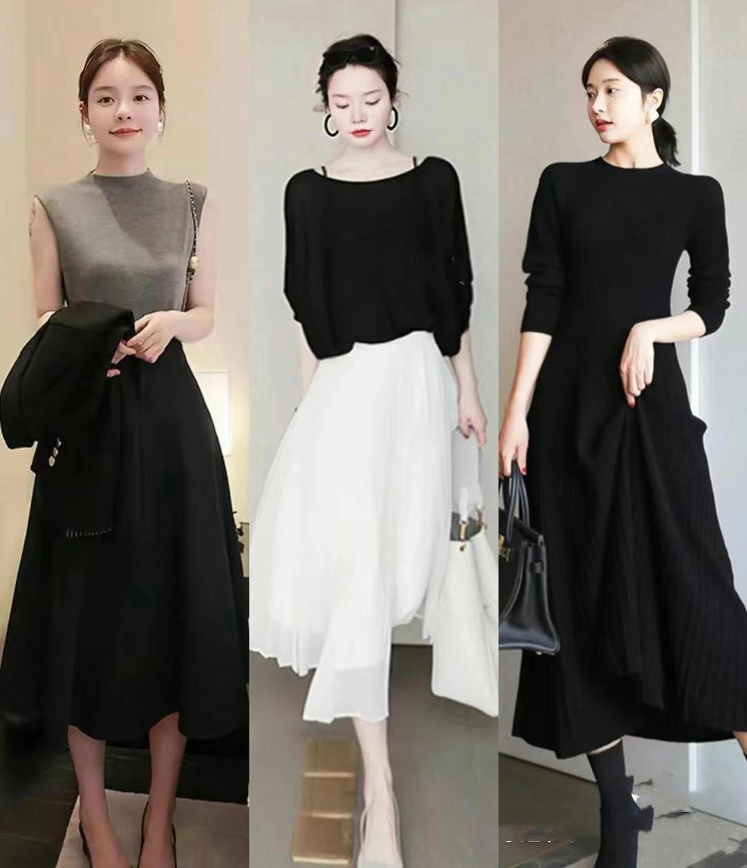 想要一種成熟優雅的穿搭,我們可以嘗試同色系的組合。比如黑色連衣裙、或者燕麥色連衣裙,以同色繫上衣+半身裙的組合。