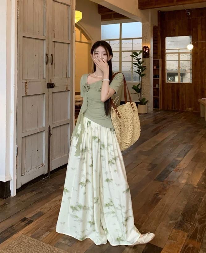 這一套新中式搭配,真的是美到了心巴上,不規則的短袖t恤+國風印花半身長裙,有種甜辣小清新感,綠色對於夏天來說,那真的是太適合了,淡淡的色調,自帶清冷氣息,簡直不要太美了。