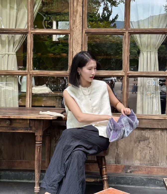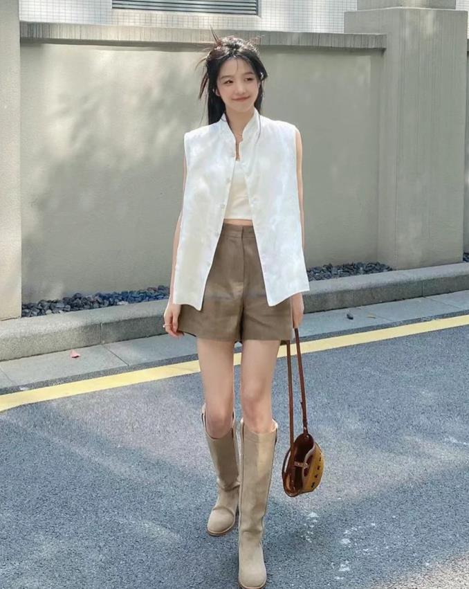 最近真的有些喜歡新中式穿搭,極簡款的白色中式背心,實在是太百搭好穿了,與卡其色的短褲、長褲相配都可以,小個子女生可以配短褲,更容易顯高挑。