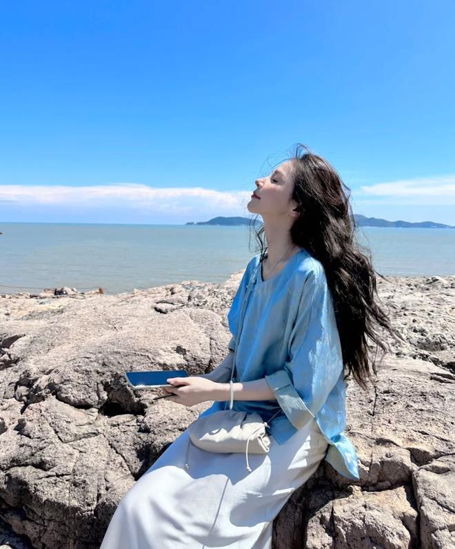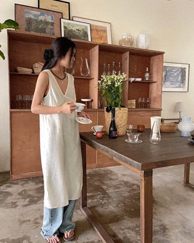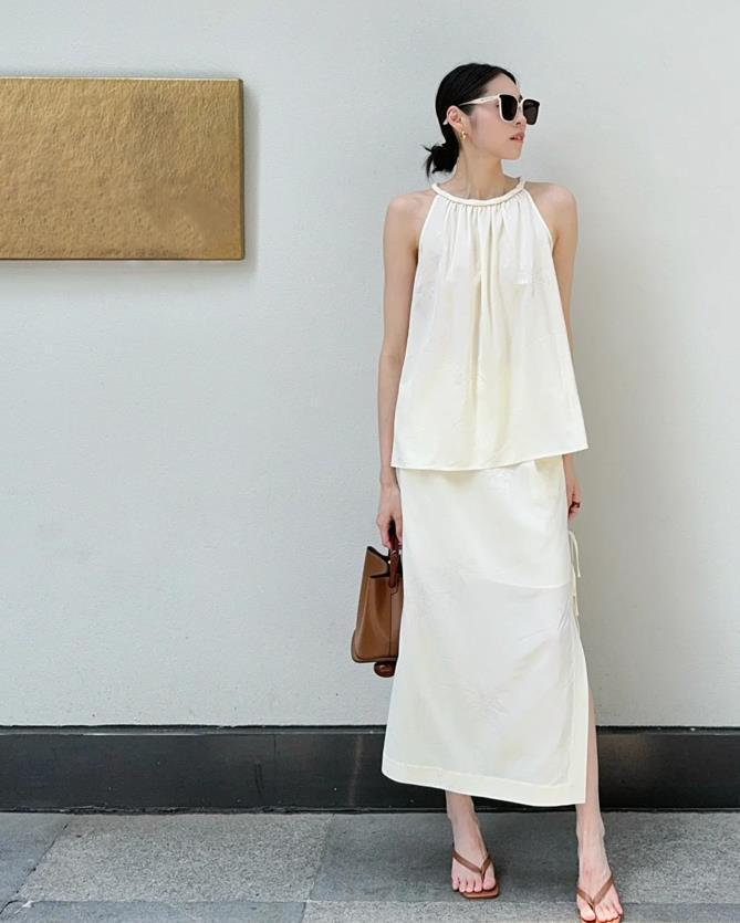 新中式的穿搭,真的是越簡約越高級時髦,這一整套同色系的組合,對於不懂搭配的姐妹來說,可是很省心的,寬鬆的掛脖式無袖上衣,夏季裏穿起來可太涼爽了。下身搭配的開叉半身長裙,不經意間就拉長腿部線條。