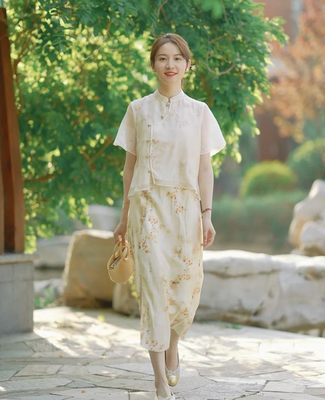 年紀大一點的女性,不知道穿什麼衣服的時候,不妨試試新中式的搭配,很溫婉氣質的新中式風格,自然、內斂的中式美學,上衣和裙子是同系列的,淡雅的花色,寧靜又溫柔,既不失古典美,又帶點清冷的氣質,氛圍感直接拉滿。