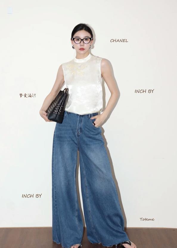 無袖衫可是很適合夏季的衣服,顏色素雅的款式,自帶清爽與涼快,選擇一條牛仔闊腿褲來配,寬鬆的褲型,實在是太藏肉顯瘦了。記得要把上衣塞進褲子裏面,這樣才能很好拉長下身比例。