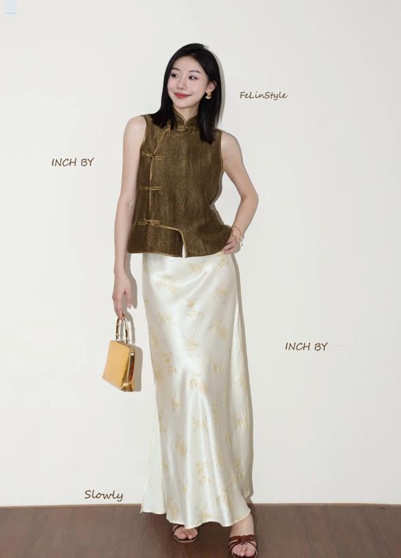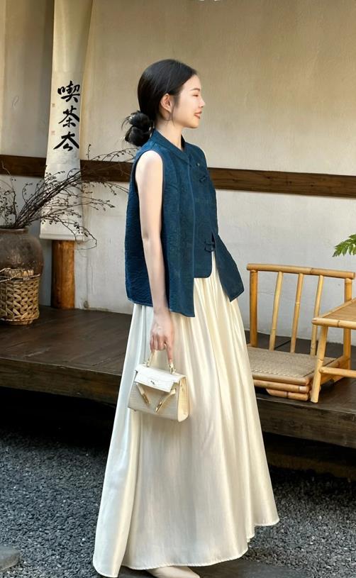 永遠都會爲新中式的穿搭着迷,今年流行極簡的新中式,重工打造的馬甲背心,搭配幫助長裙,一整個看起來就非常溫柔和大方了。裙子上面是提花的面料,自帶高級精緻還不失氣質,輕鬆就能展現出優雅氣質。