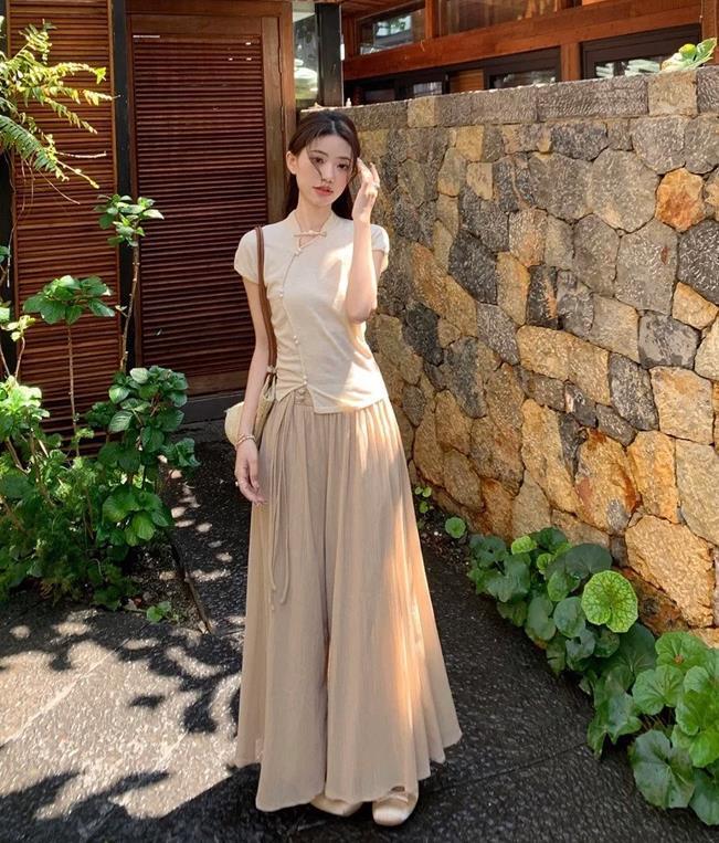 喜歡新中式穿搭的姐妹,說什麼也要嘗試下這一套極簡清冷感的穿搭,看起來真的非常顯氣質呢,國風盤扣立領短袖t恤+闊腿褲,太適合夏天穿了。
