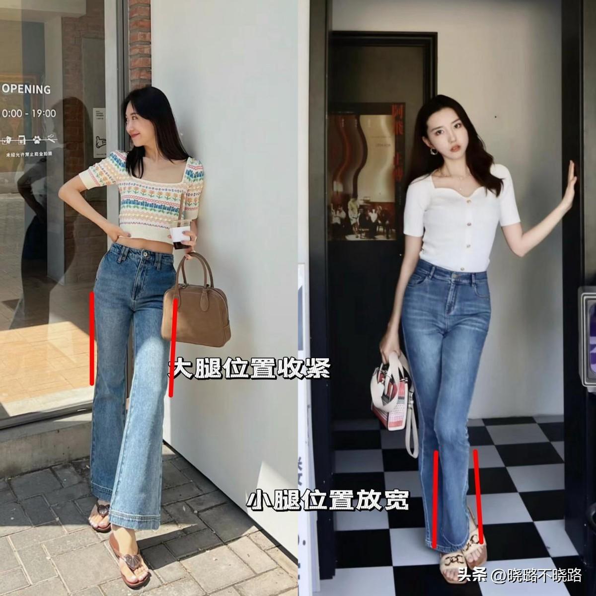 貼身的剪裁穿在身上,暴露“三角區”很容易讓人尷尬,換成褲型更時髦的喇叭褲,上窄下寬的設計,更有利於修飾腿型。