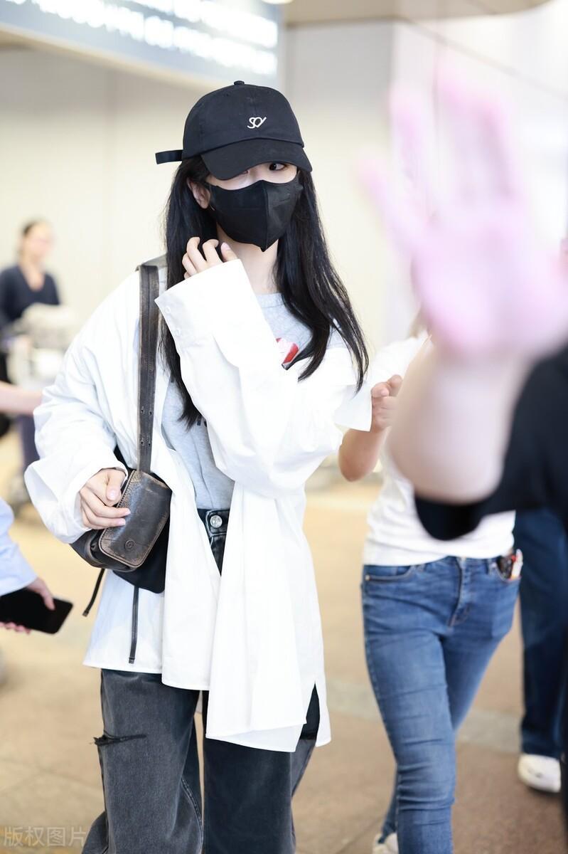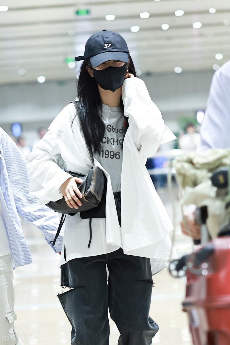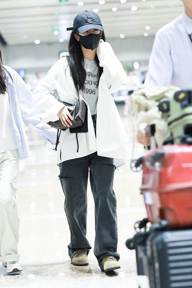 從巴黎返程,楊紫的穿搭依然是活潑大方。寬鬆的白色外套,搭配了灰色字母印花T恤,一條寬鬆的直筒牛仔褲、又酷又美。