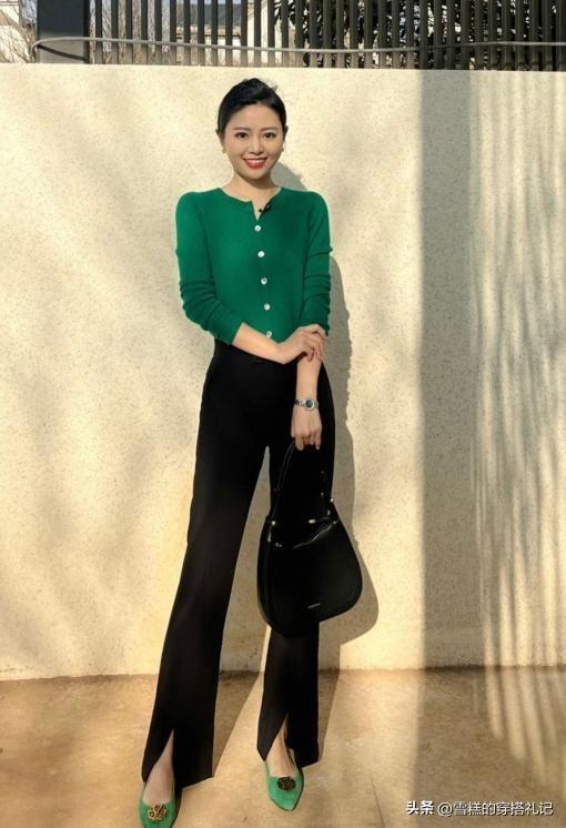 如果我們本身的膚色屬於冷白皮的話,那麼大可以適當的增加亮色的面積。選擇一件綠色的奶奶衫,搭配黑色的開叉褲,可以讓整體形象既顯得溫柔又有活力,同時又高級洋氣。腳上的單鞋與奶奶衫顏色相互呼應,從而增加了造型的和諧感。