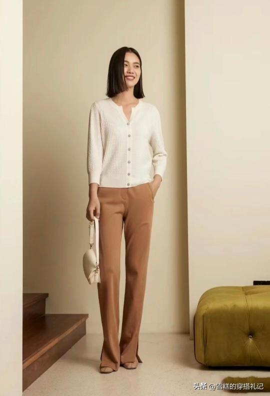 選擇柔軟的奶奶衫,可以讓造型保持足夠的舒適度。結合V領的設計,還可以延伸脖頸線條,凸顯細節感。而搭配一條卡其色的直筒褲,流暢的剪裁可以展現我們腿部的線條美感。通過搭配高腰的設計,可以巧妙地塑造簡約而又大方的風格,彰顯幹練氣息。