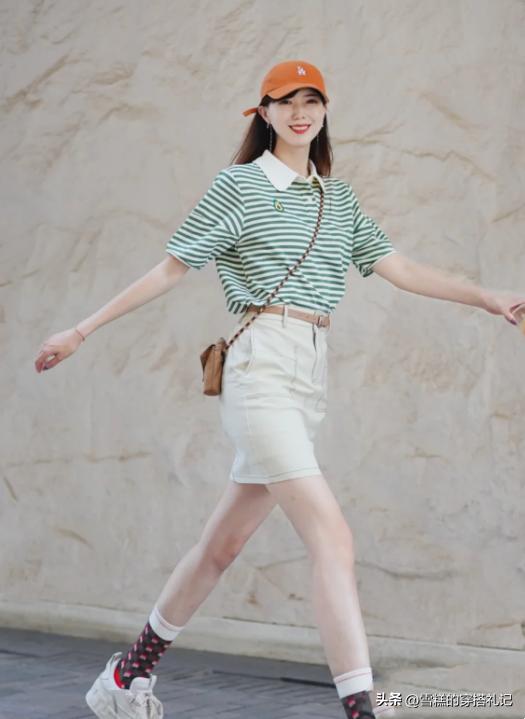 搭配方案㈠ :綠色條紋POLO衫+白色短裙+橙色棒球帽