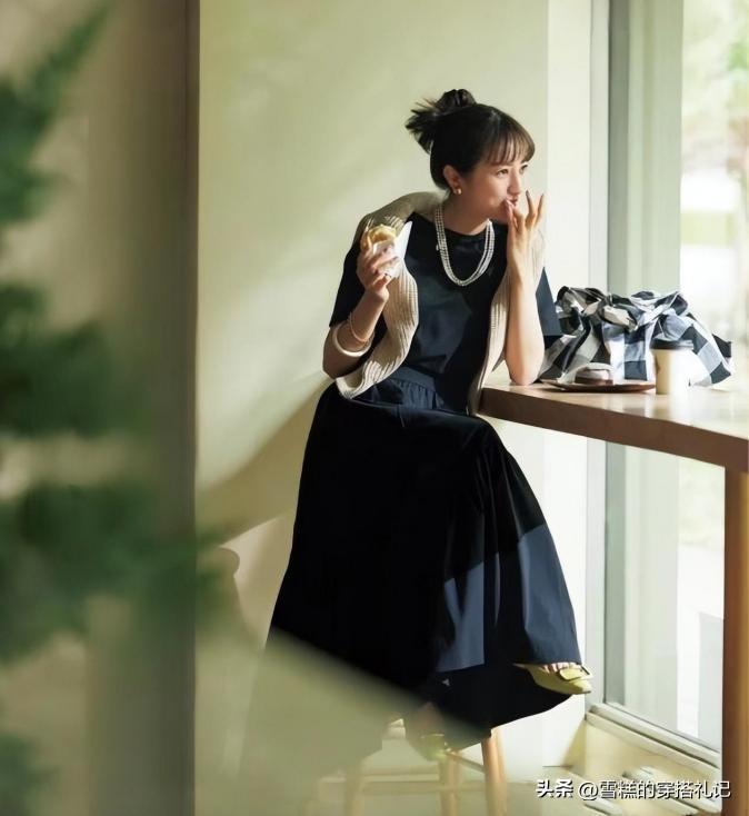 選擇同色系的配色方案,不僅可以避免色彩搭配出錯,同時又能讓造型顯得更加和諧和高級。選擇黑色作爲主色調,具有優雅氣息和神祕色彩,並且簡約而又經典。而白色的披肩作爲點綴,可以化解深色的沉悶,還能夠營造出一種休閒和隨性的氛圍。
