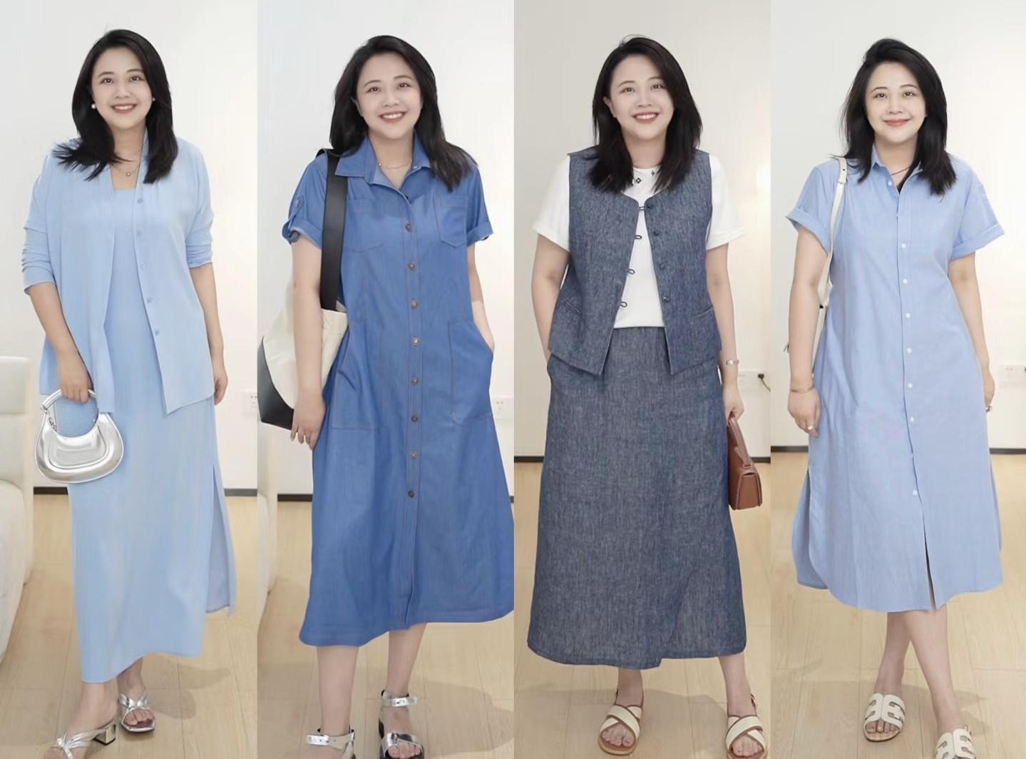 比如寬鬆的襯衫連衣裙,適度的收腰不浮誇、流暢而垂順的剪裁穿上身也很大氣。用淺藍色襯衫裙,配白色的涼拖,就是清爽又體面的。