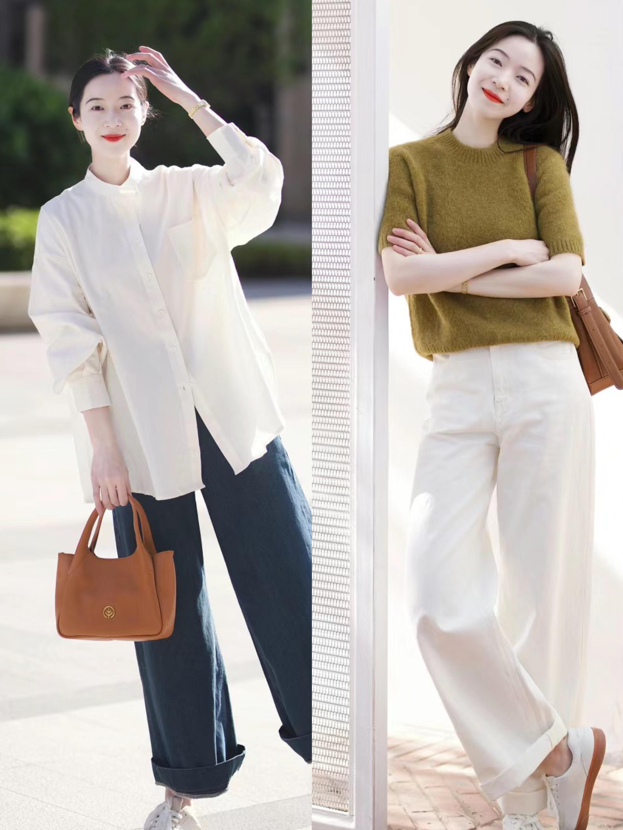 我們選擇白色直筒褲的時候,儘量搭配比較寬鬆一點的褲型。直筒褲帶有一定的鬆弛感,穿在身上包容性也更強,露出腳踝位置、也更洋氣。