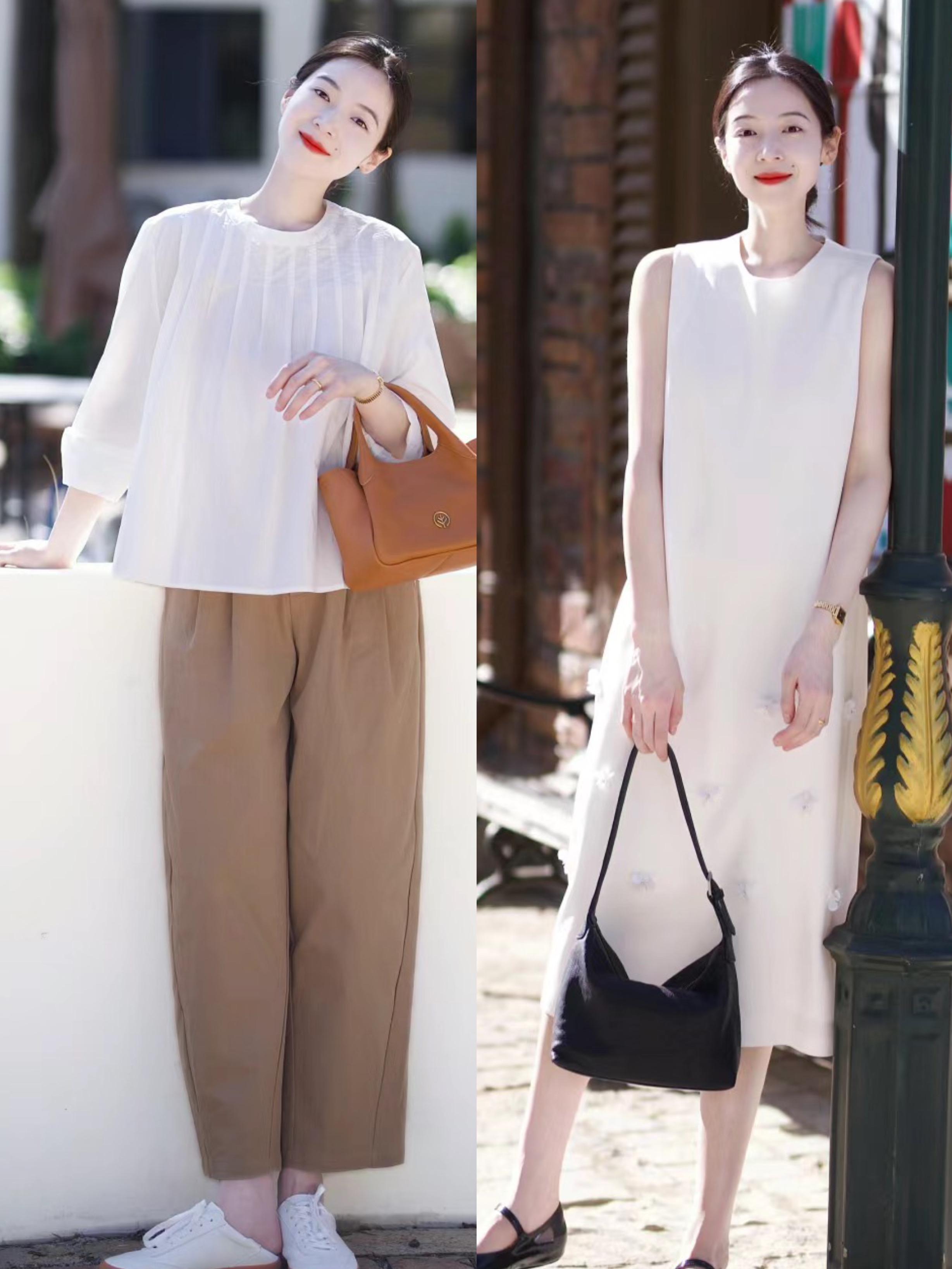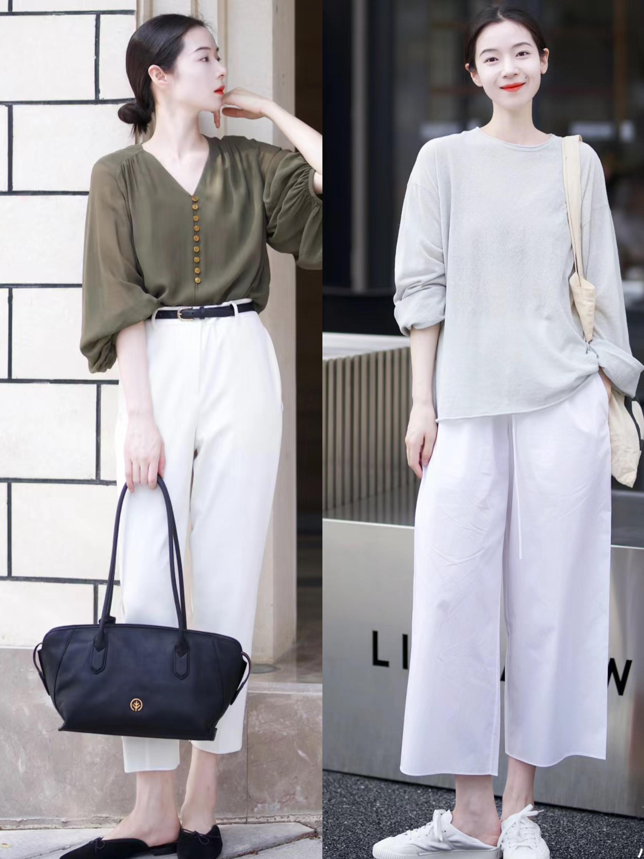 白色系的服裝那麼多,除了連衣裙、白襯衫、白色直筒褲也得安排起來呀。直筒褲修飾腿型、清爽又大方。