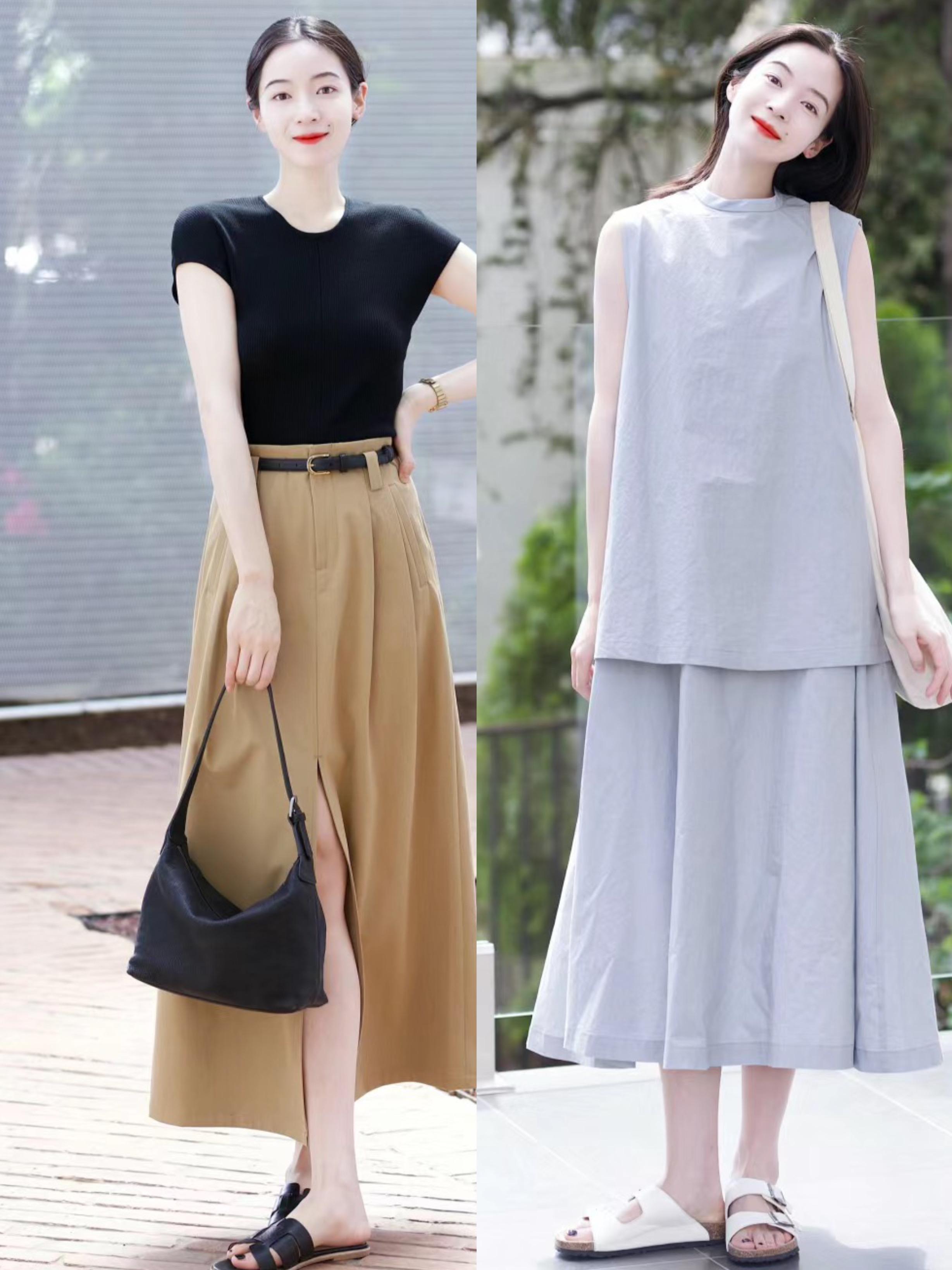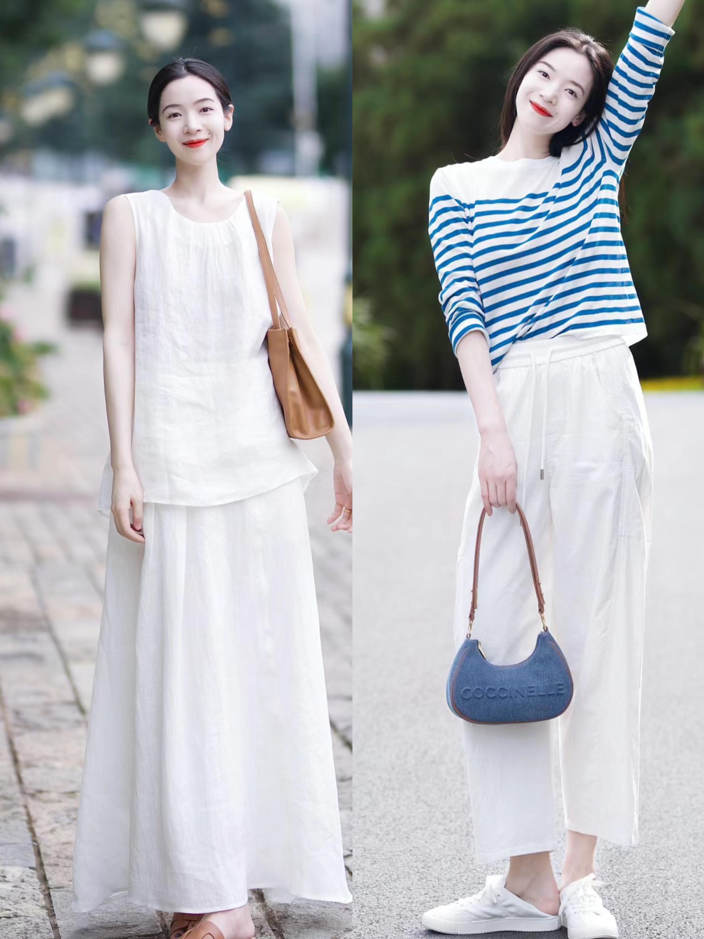 無袖的白色背心+A字形的半身裙,組合成白色系的棉麻套裙,上身就像自帶反光板一般、簡約又顯白,夏天裏穿自帶清涼感。