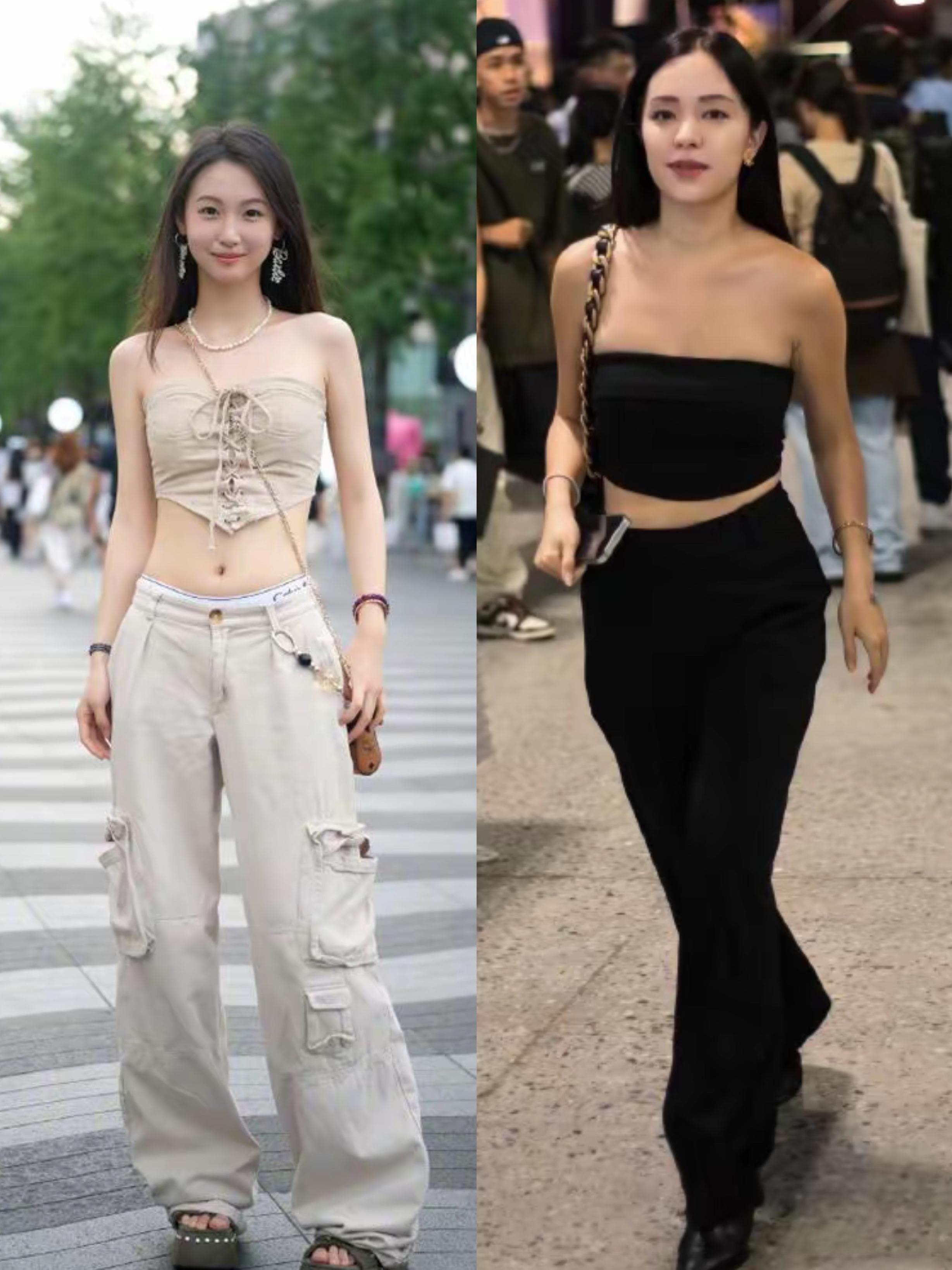 抹胸的背心,可以選擇抽繩設計,更加時髦醒目。以抹胸背心搭配高腰的拖地褲,上短下長的組合選擇同色系的搭配,時髦熱辣、盡顯高級之美。