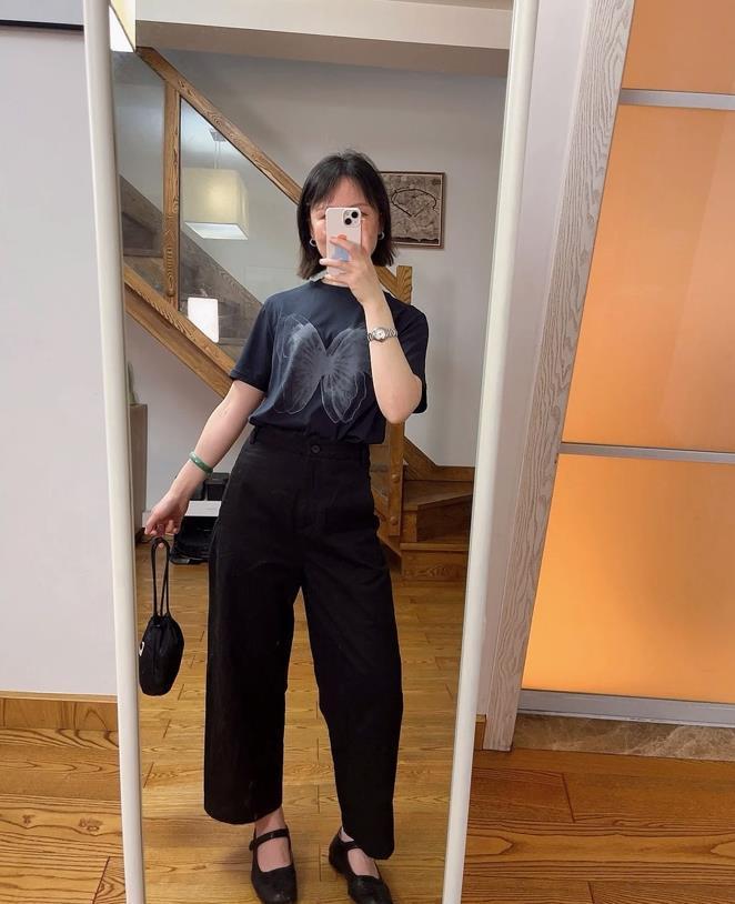 黑色的九分高腰直筒褲,穿起來可以完美修飾你的腿部線條,讓你的雙腿看起來更加修長纖細。T恤和褲子的版型都是寬鬆的,這麼組合在一起,咋一看就有種隨性範,記得要把t恤塞進褲子裏面,巧妙拉長腿部線條。鞋子選擇的是一雙黑色瑪麗珍單鞋,也太溫柔和舒適了。
