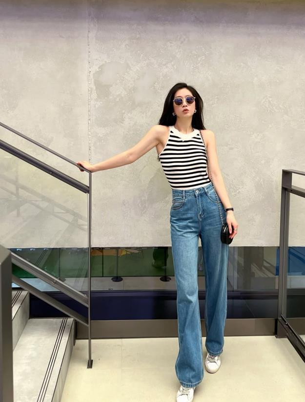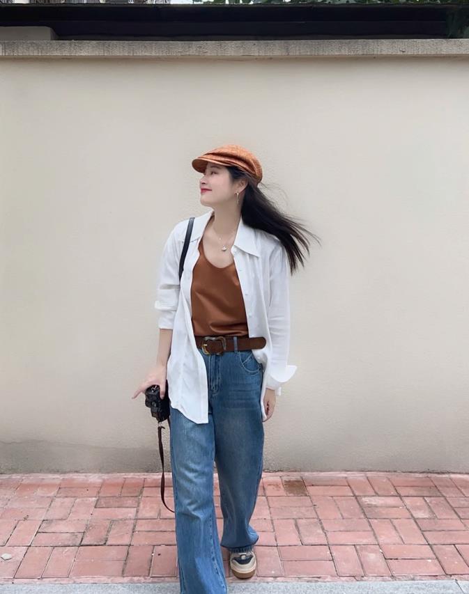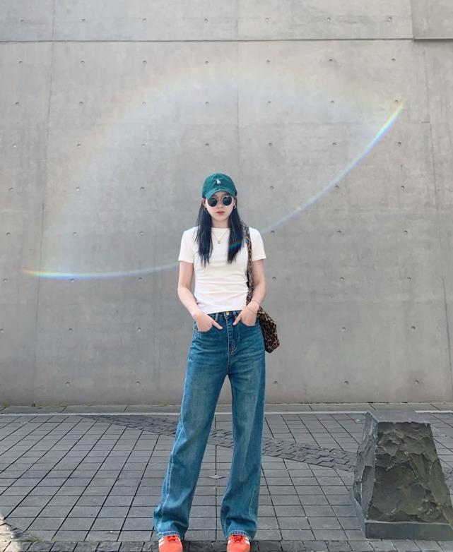 水洗牛仔藍直筒褲,這種版型的褲子,可是很修飾腿部線條的,哪怕你是腿粗的女生,也可以穿得很顯瘦。上衣簡單配了件白色背心,雖然穿得很簡單,卻也非常舒適。