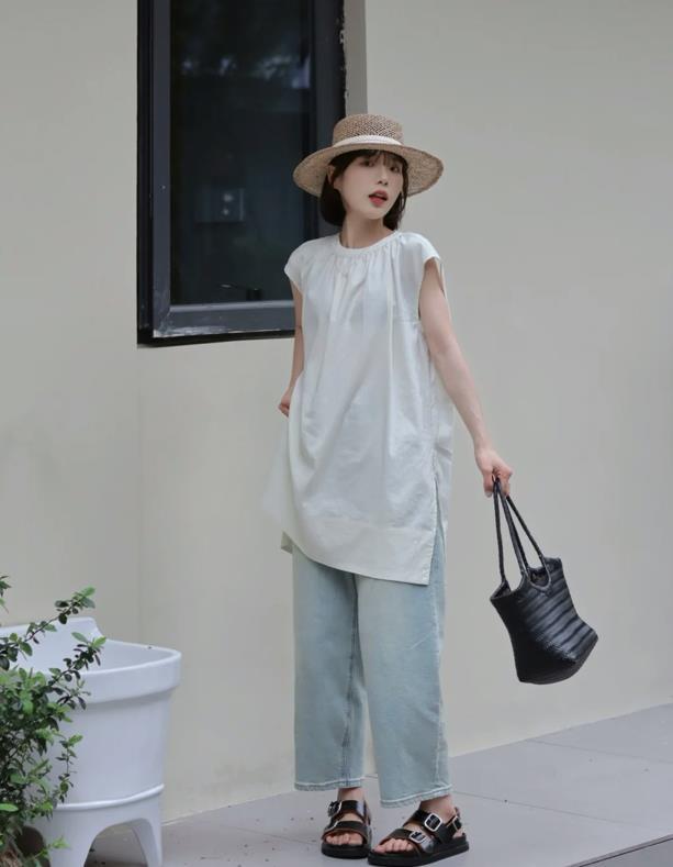 入夏真的很適合這麼穿呢,水洗淺色牛仔直筒褲,這種顏色的褲子很好搭配衣服,與白色無袖衫來配,乾淨清爽又舒適。腳下搭配一雙黑色勃肯涼鞋,簡約又不失日常的一套。