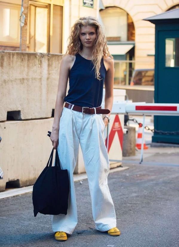 運動鞋可是時尚圈裏最常見百搭的鞋款了,它可以與各種上衣下裝相配,從而營造出休閒舒適的效果,白色運動鞋配牛仔藍直筒褲,這麼一套看起來也太清新自然了。也可以選擇彩色的運動鞋,搭配深色直筒褲,增添造型的活力氣息。