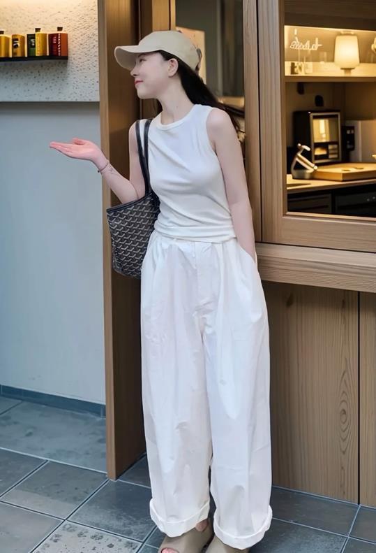 很適合悶熱夏季的一套穿搭,極簡風的裝扮,一整個顯得很鬆弛舒適,同色系的組合,自帶高級感,這對於不懂配色的姐妹來說,可是很友好的。白色背心+白色高腰直筒褲,乾淨慵懶又舒服,無論是日常逛街,還是出遊都很好看。