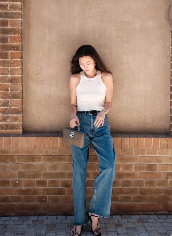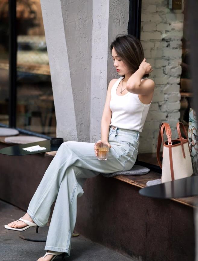 白色背心+九分牛仔直筒褲,輕輕鬆鬆就可以get時髦和隨性風了,記得要將腰線提高起來,這樣才能更時髦和顯高挑。腳下踩着一雙細高跟涼鞋,也太顯優雅和氣質了。