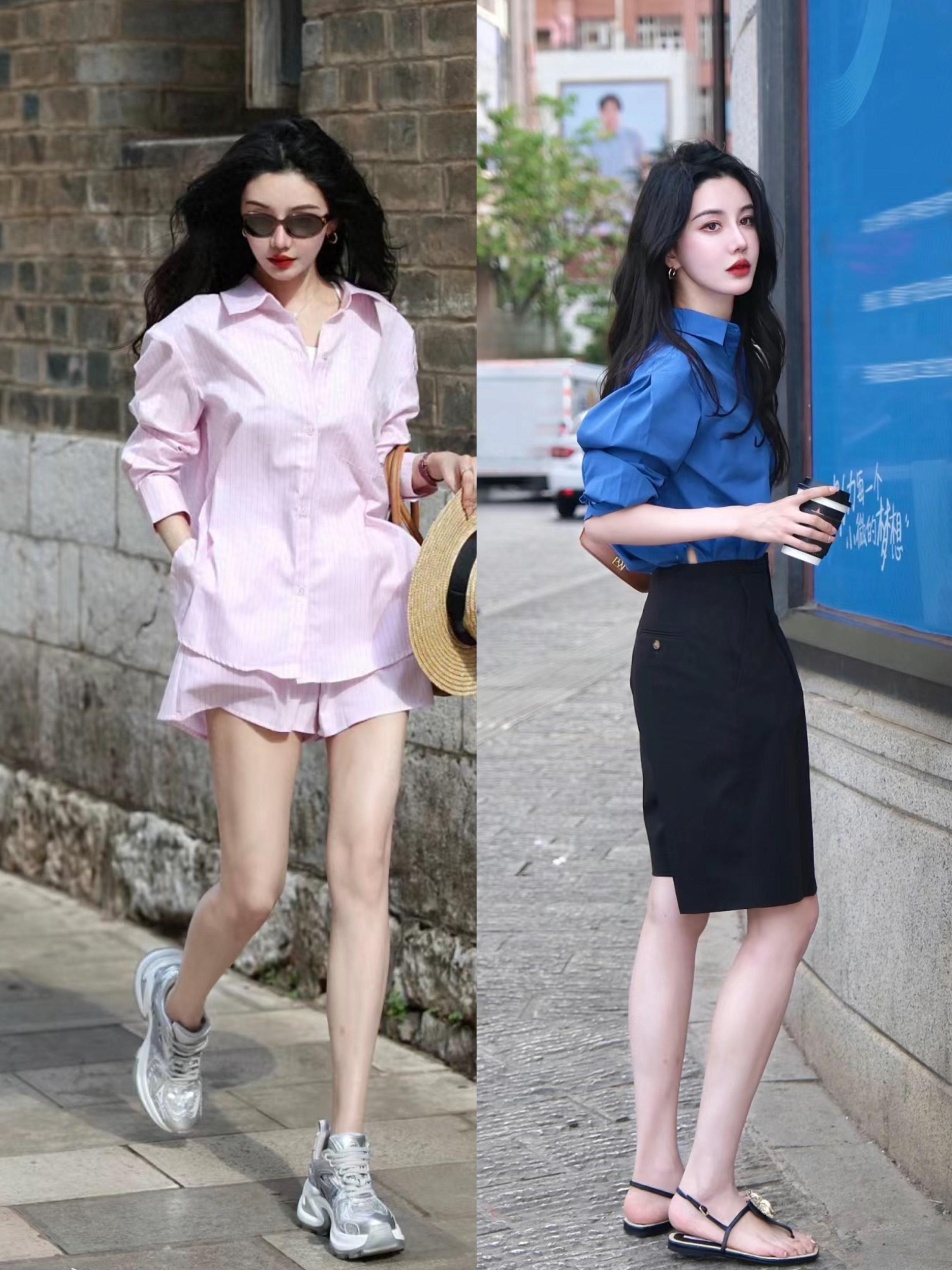 粉色襯衫套裝+厚底的老爹鞋,活力十足又很顯腿長。克萊因藍的襯衫,挽起衣袖的瞬間就多了幾分酷感,配西裝短褲又美又颯!