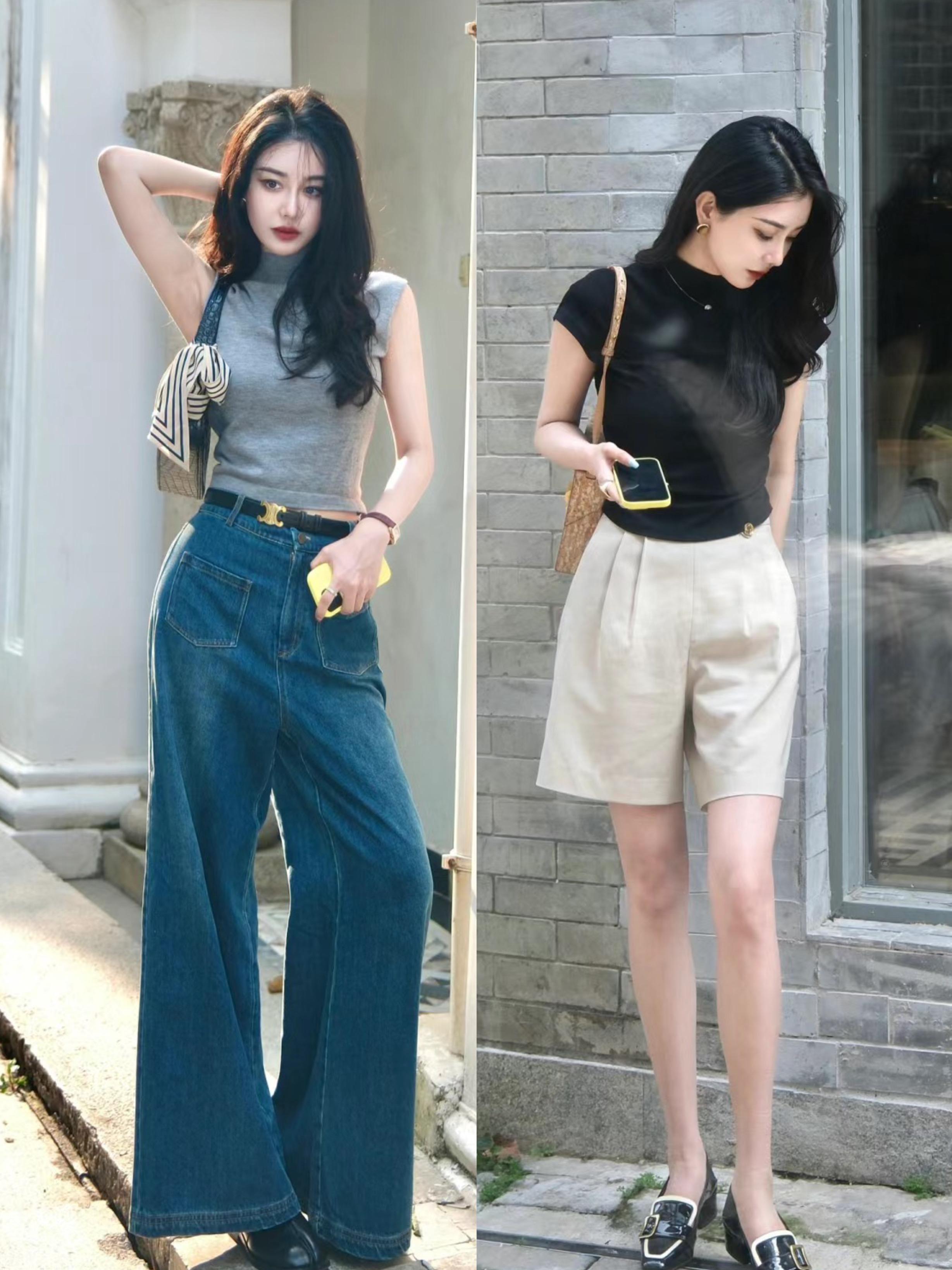 以修身的T恤,來搭配寬鬆的短褲、或者闊腿褲,這種反差對比更顯的腰細腿長。尤其是修身T恤+高腰闊腿褲的組合,熱辣中帶了幾分酷颯、很洋氣。