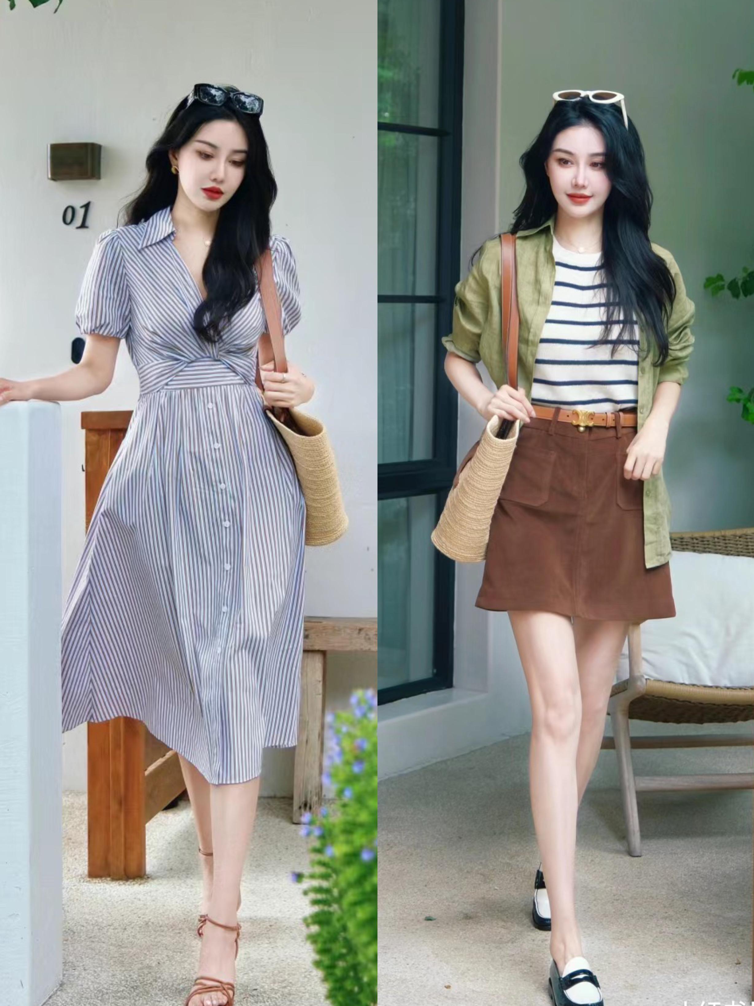 修身的條紋連衣裙,也可以營造出度假氛圍,只需要搭配草編元素的包袋就夠了。條紋T恤搭配A字形半身裙,也可以隨性慵懶。
