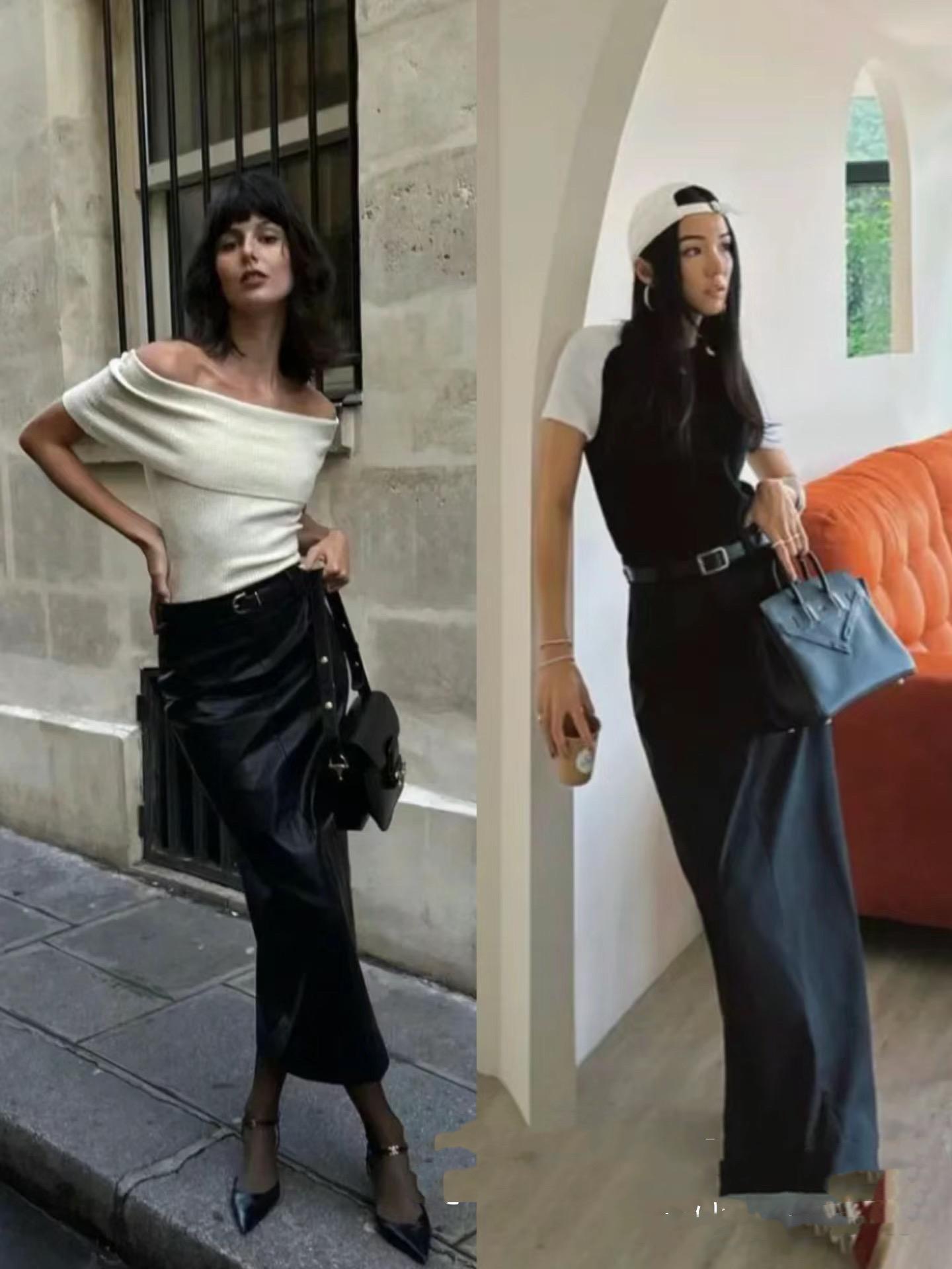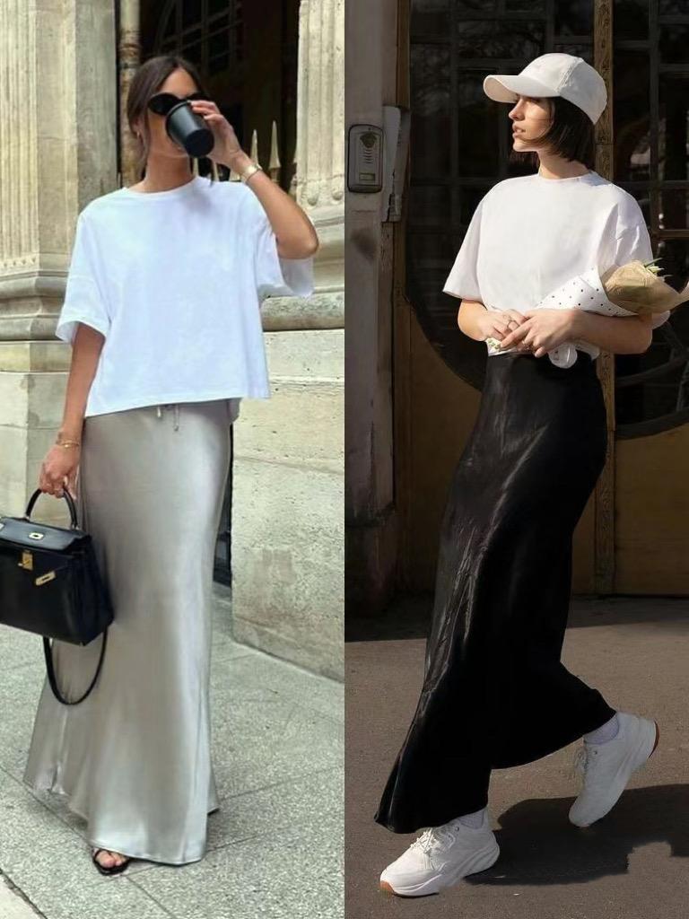 醋酸半身裙自帶垂順感、視覺上有一種高級美。黑色醋酸半身裙,更加大氣顯瘦,銀白色醋酸半身裙,更加優雅利落。
