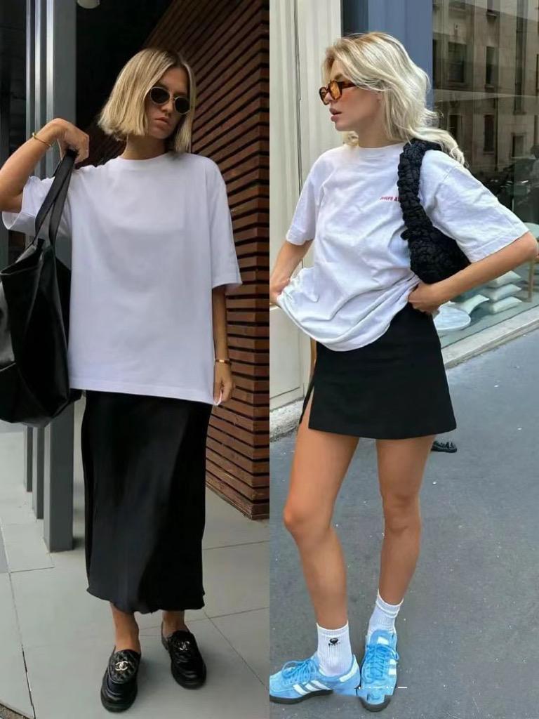 夏天不管哪一種顏色的T恤,都可以配黑色半身裙。尤其是經典的白色T恤,與黑色半身裙更是絕妙的搭配。