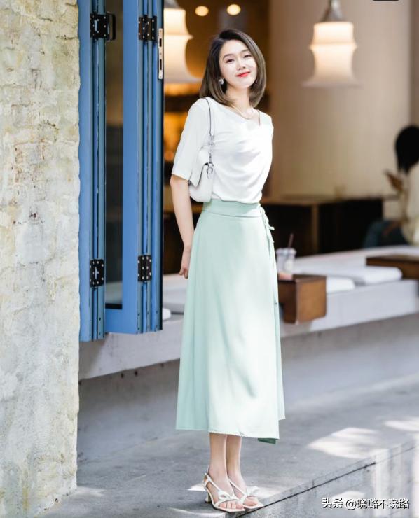 我們無論是選擇褲子還是裙子,在與鞋子進行搭配的時候都可以採用順色搭配的方式,來讓下半身的縱向曲線得到更明顯的拉長。當然了,如果搭配深色系的話會更具有顯瘦的效果。不過淺色系的組合式搭配,會更顯輕盈和減齡。