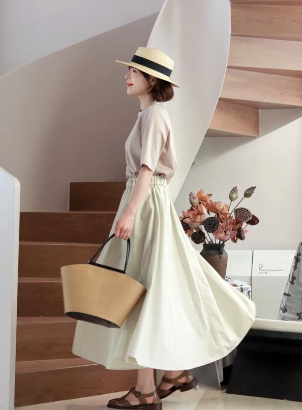 這一套的穿搭配色看起來也太高級了,既不失溫柔氣質,又很時髦,奶茶色的短袖t恤,搭配淺米色半身裙,一套都自帶高級感,再搭配同色包包、鞋子和帽子,毫不費力就展現出法式感。